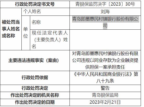 劉海因?qū)η鄭u即墨惠民村鎮(zhèn)銀行股份有限公司違規(guī)以同業(yè)存款為企業(yè)融資提供擔(dān)保一案承擔(dān)責(zé)任,依據(jù)《中華人民共和國商業(yè)銀行法》第八十九條,警告(青銀保監(jiān)罰決字〔2023〕30號(hào))。
