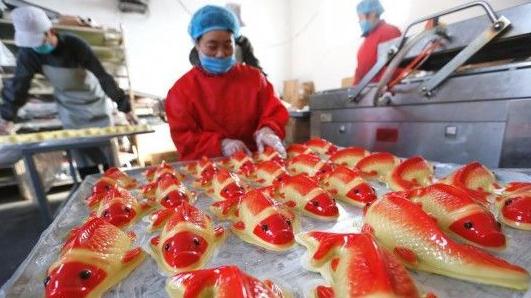 1月24日,即墨區(qū)移風(fēng)店鎮(zhèn)李家莊村農(nóng)民在加工年糕。 進(jìn)入臘月以來,大沽河一帶村莊年糕加工迎來生產(chǎn)旺季。當(dāng)?shù)赜羞^年做年糕的習(xí)俗,農(nóng)民用大黃米和糯米等原料調(diào)和制作成吉祥魚、元寶、福字等形狀的年糕,寓意生活一年更比一年好。