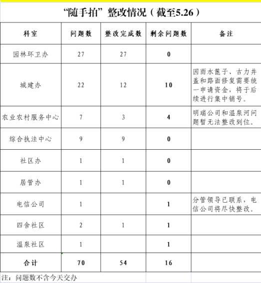 二、建立督查機(jī)制。溫泉街道對每日工作群中的問題進(jìn)行清單化管理,每一處具體問題指定責(zé)任科室,實(shí)行“日交辦”“周通報(bào)”制度,每日對清單中的問題整改情況進(jìn)行督查,實(shí)行銷號管理,并將督查情況及時(shí)發(fā)在“隨手拍”微信群內(nèi),每周對問題銷號情況進(jìn)行通報(bào)。截止5月25日,共發(fā)現(xiàn)各類問題69處,整改完成48處,效果顯著。小手機(jī)“隨手拍”,在創(chuàng)城工作中發(fā)揮了大作用。