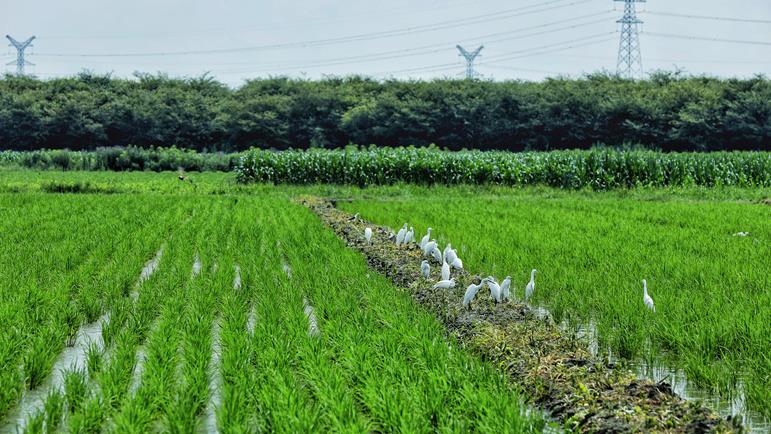 連片優(yōu)質(zhì)水稻田里,數(shù)十只白鷺時(shí)而振翅起飛,時(shí)而穿梭稻田覓食,時(shí)而漫步田埂,成為綠色稻田里的亮麗風(fēng)景線。