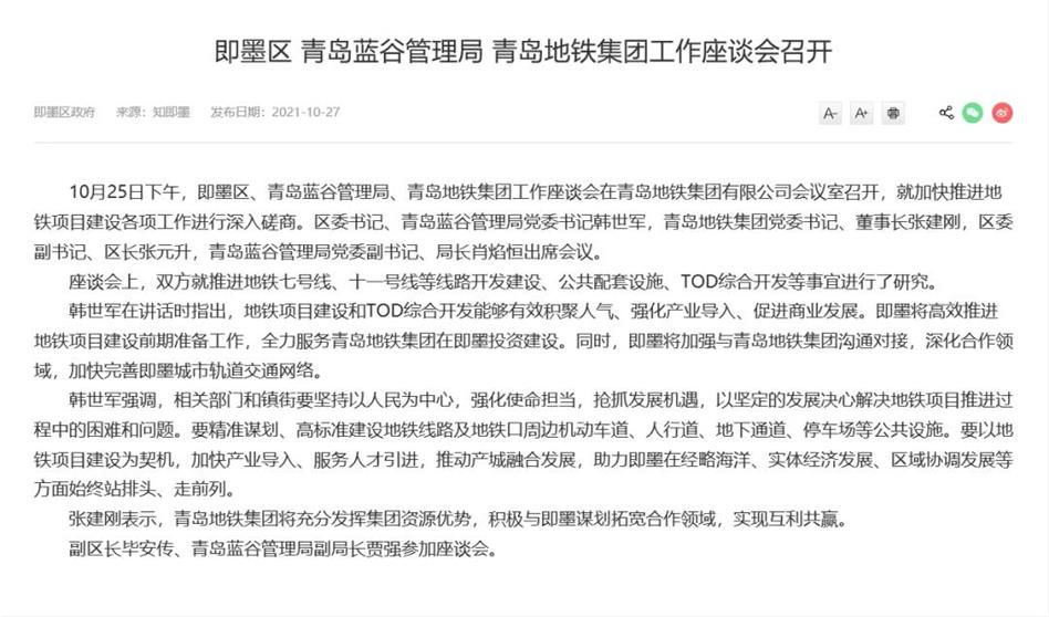 即墨區(qū)青島藍(lán)谷管理局 青島地鐵集團(tuán)工作座談會(huì)召開(kāi)