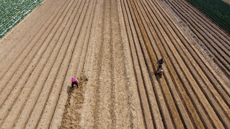 山東省青島市即墨區(qū)移風(fēng)店鎮(zhèn)女兒村農(nóng)民在播種生姜。(無人機照片)