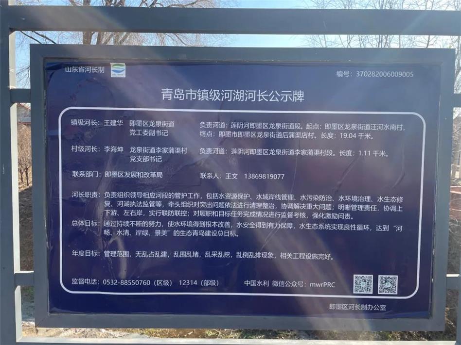 記者首先撥打了公示牌中聯(lián)系部門——即墨區(qū)發(fā)改局工作人員的電話,該工作人員表示,目前該公示牌信息時效性已過,公示牌未及時更換,目前發(fā)改部門不再參與該河段的管理。