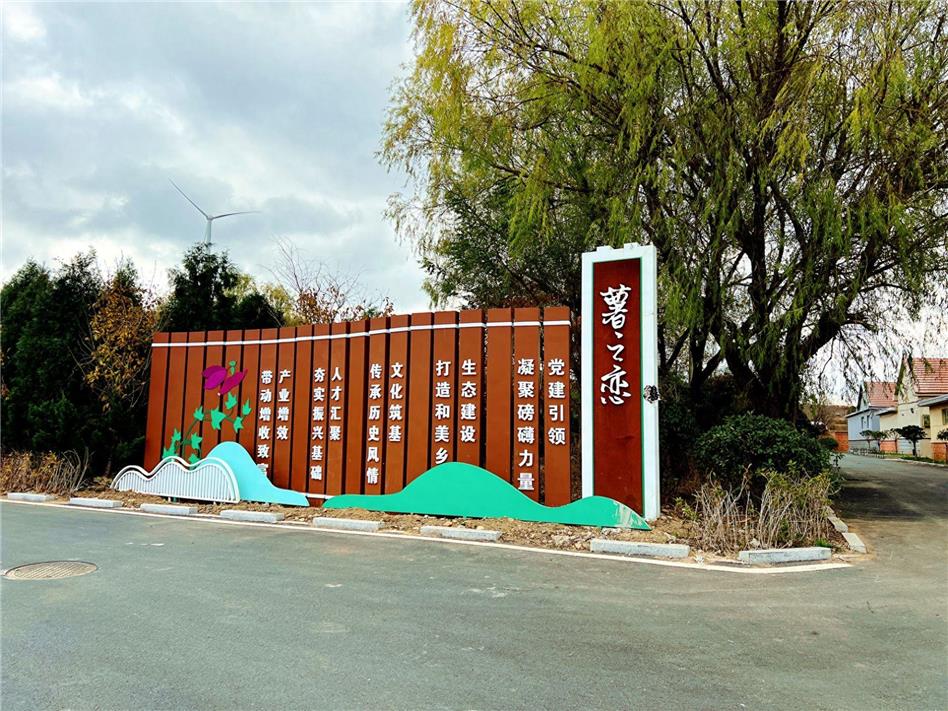 河?xùn)|村通往地瓜種植基地的路邊,豎立著“薯之戀”主題展板