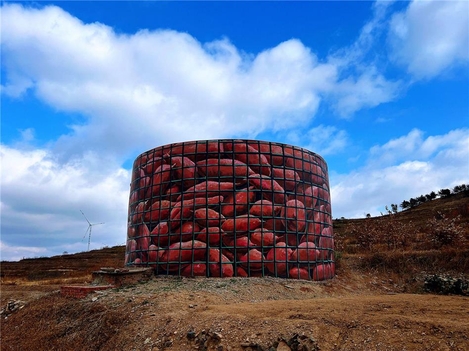 河?xùn)|村地瓜種植基地里,“地瓜滿囤”的主題墻繪特別引人注目
