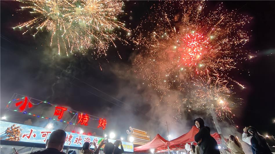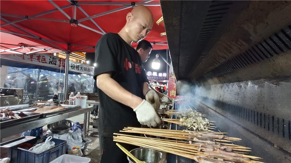 千米長的燒烤街,家家座無虛席,門前還有不少顧客正排隊等座!昂芟矚g來這里,坐著馬扎,吃著烤肉非常接地氣!币晃活櫩驼f,氤氳的煙火氣讓他在大快朵頤同時,感受到濃濃的氛圍感。