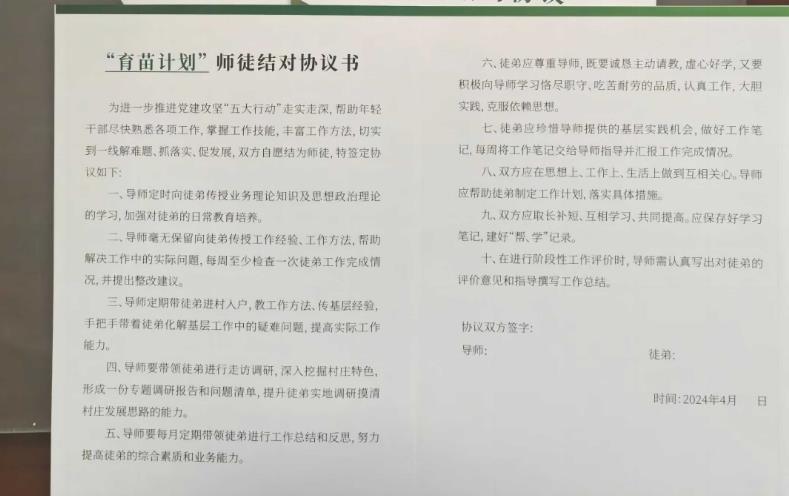 采取師徒結(jié)對的方式,從“班子成員帶年輕中層”“中層帶年輕干部”“包村干部幫帶”三個層面,采取“一對一”“一對多”“多對一”相結(jié)合的方式開展“導師幫帶雁陣”行動,在現(xiàn)場簽訂《“育苗計劃”師徒結(jié)對協(xié)議》。
