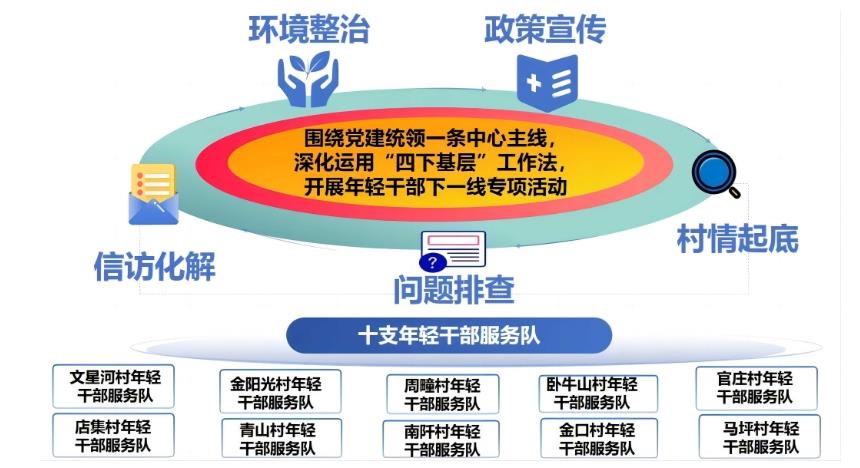 通過構(gòu)建“1·5·10”組織架構(gòu)體系,確保專項行動順利開展。其中“1”是指堅持黨建統(tǒng)領一條主線,深化運用“四下基層”工作法,成立鎮(zhèn)黨委專項行動指揮部,統(tǒng)籌抓好鎮(zhèn)域內(nèi)各項重點工作任務落實;“5”是指成立“政策宣傳”“村情起底”“問題排查”“信訪化解”“環(huán)境整治”5個工作推進專班,明確分工,各司其職;“10”是指對應10個新村建立10支“年輕干部服務隊”,下沉所有自然村,每支隊伍明確帶隊領導,配備副隊長和聯(lián)絡員,各包村年輕干部根據(jù)專班下發(fā)的任務及《包村干部職責》開展下沉工作。