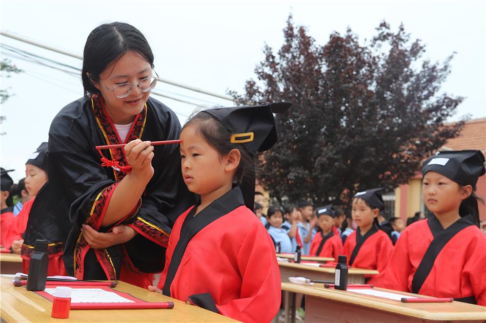 活動在“正衣冠”環(huán)節(jié)中開始,學生們身著統(tǒng)一的傳統(tǒng)服飾,整齊劃一地整理自己的衣著,寓意著從此刻起,要以嶄新的面貌和姿態(tài)迎接學習生涯。在“啟蒙描紅”環(huán)節(jié)中,拿起毛筆,在老師的指導下,一筆一劃地描紅“人”字。這個簡單的字卻蘊含著深刻的道理,提醒學生們要做人正直、堂堂正正。隨后,學生們在“朱砂啟智”“擊鼓明志”“行拜師禮”頌讀《三字經》等一系列環(huán)節(jié),感受到了中華文化的博大精深和無窮魅力。