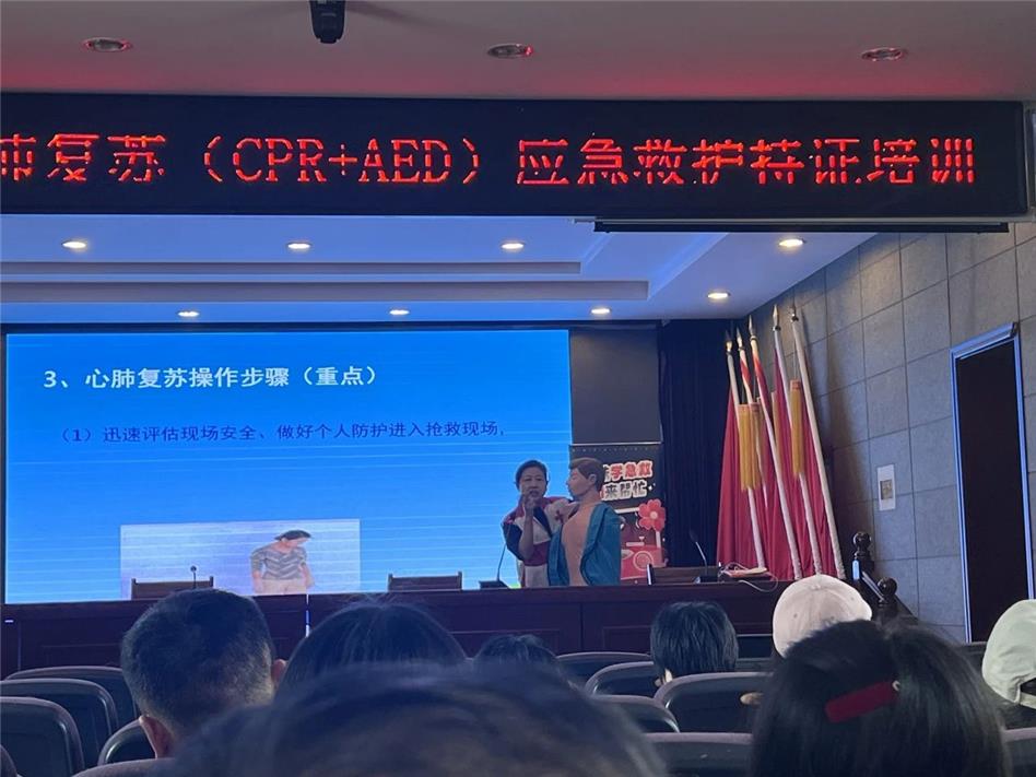 通過理論測試成績合格后,所有參訓(xùn)人員以10-15人為一組進(jìn)行實(shí)操考核。老師首先向大家完整示范了心肺復(fù)蘇和自動(dòng)體外除顫儀(AED)的操作流程,隨后學(xué)員分為七組進(jìn)行模擬演練,每組專門設(shè)置助教,及時(shí)糾正參訓(xùn)人員在演練過程中的不規(guī)范操作,確保參訓(xùn)人員,掌握到位,操作到位。