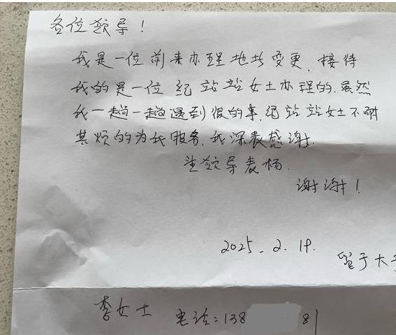 “我在辦這個(gè)業(yè)務(wù)的過程中有很多不明白的地方,紀(jì)站站女士不厭其煩地為我服務(wù),我深表感謝!苯,即墨區(qū)靈山街道便民服務(wù)中心收到一封來自市民李女士的手寫感謝信,信中情真意切地表揚(yáng)了商事登記窗口工作人員紀(jì)站站。