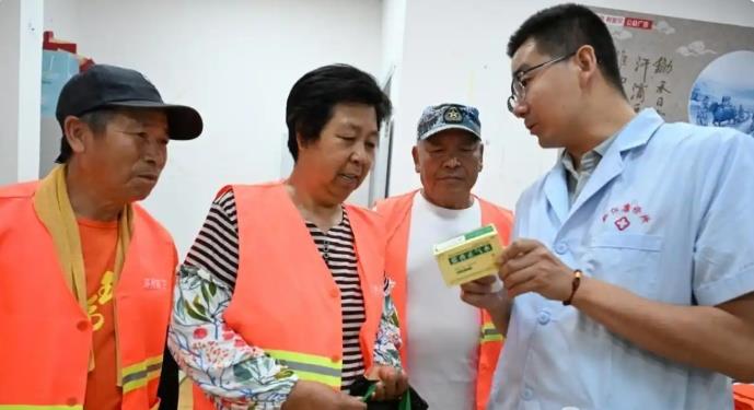 志愿者為環(huán)衛(wèi)工人送上藿香正氣水、風(fēng)油精、毛巾等防暑物品。(來(lái)源:即墨區(qū)委宣傳部)