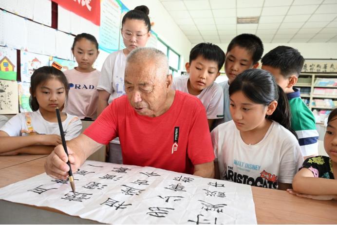 “我們學(xué)習(xí)的是撇、點、捺……”7月16日,在山東省青島市即墨區(qū)龍山街道西程哥莊村的暑假公益托管班上,90歲的江敦仁正耐心地指導(dǎo)小學(xué)生寫毛筆字。還有20多名小朋友都在認(rèn)真地學(xué)習(xí)毛筆字。今年已經(jīng)是江敦仁從中學(xué)校長的崗位退休后的第20年在暑假公益托管班教孩子們學(xué)習(xí)書法。