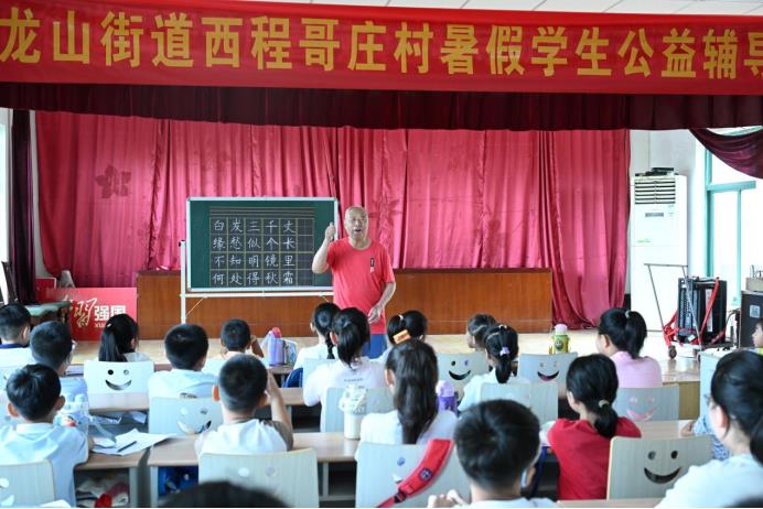 “爺爺好!”“孩子們好,請坐下!薄爸x謝爺爺!”7月16日,即墨區(qū)龍山街道西程哥莊村文化大院的暑期公益“課外輔導(dǎo)班”又開課了。在課堂上,四十多名小學(xué)生整齊端坐,目光專注地投向講臺中央。那里,90歲高齡的江敦仁老人正進(jìn)行著新一年暑期公益輔導(dǎo)班的“開學(xué)第一講”。