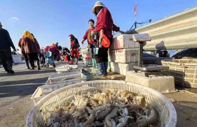 “快來看看!剛上岸的梭子蟹,35元一斤,保準(zhǔn)新鮮。”漁家大嫂王秀麗從船上接過一筐梭子蟹,麻利地放在攤位上,大聲吆喝起來。她的攤位前很快圍滿了人,有的市民已經(jīng)迫不及待地蹲下身,用手輕輕捏著蟹子的腹部,挑選著肥美的梭子蟹。
