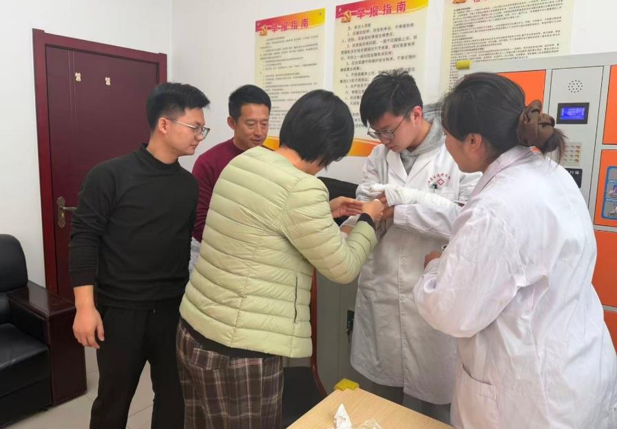 實操環(huán)節(jié)中,衛(wèi)生院醫(yī)護人員以模擬傷口為教具,手把手指導(dǎo)學(xué)員運用紗布、繃帶進行操作,及時糾正“包扎過緊影響血運”“打結(jié)位置不當(dāng)”等問題。紀(jì)工委工作人員分別演練、相互糾錯,現(xiàn)場互動頻繁,迅速掌握了標(biāo)準(zhǔn)化操作要領(lǐng)!耙酝龅酵话l(fā)外傷常手足無措,現(xiàn)在學(xué)會了規(guī)范處置方法,履職更有底氣!奔o(jì)工委工作人員表示。