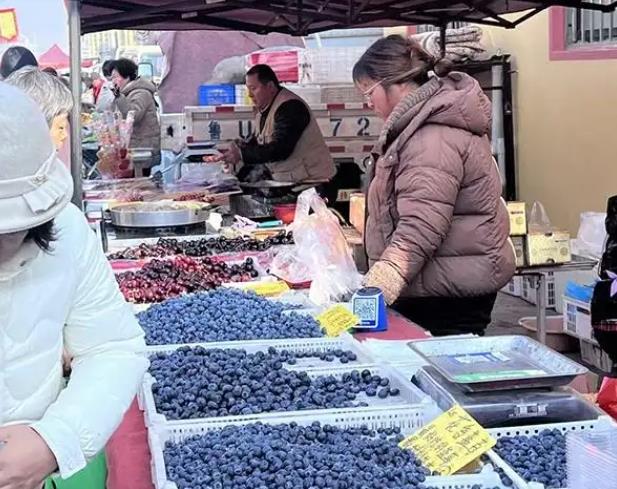 水果攤前色彩繽紛,砂糖橘、車厘子、藍莓堆成小山,本地草莓帶著露珠,吸引顧客駐足嘗鮮。